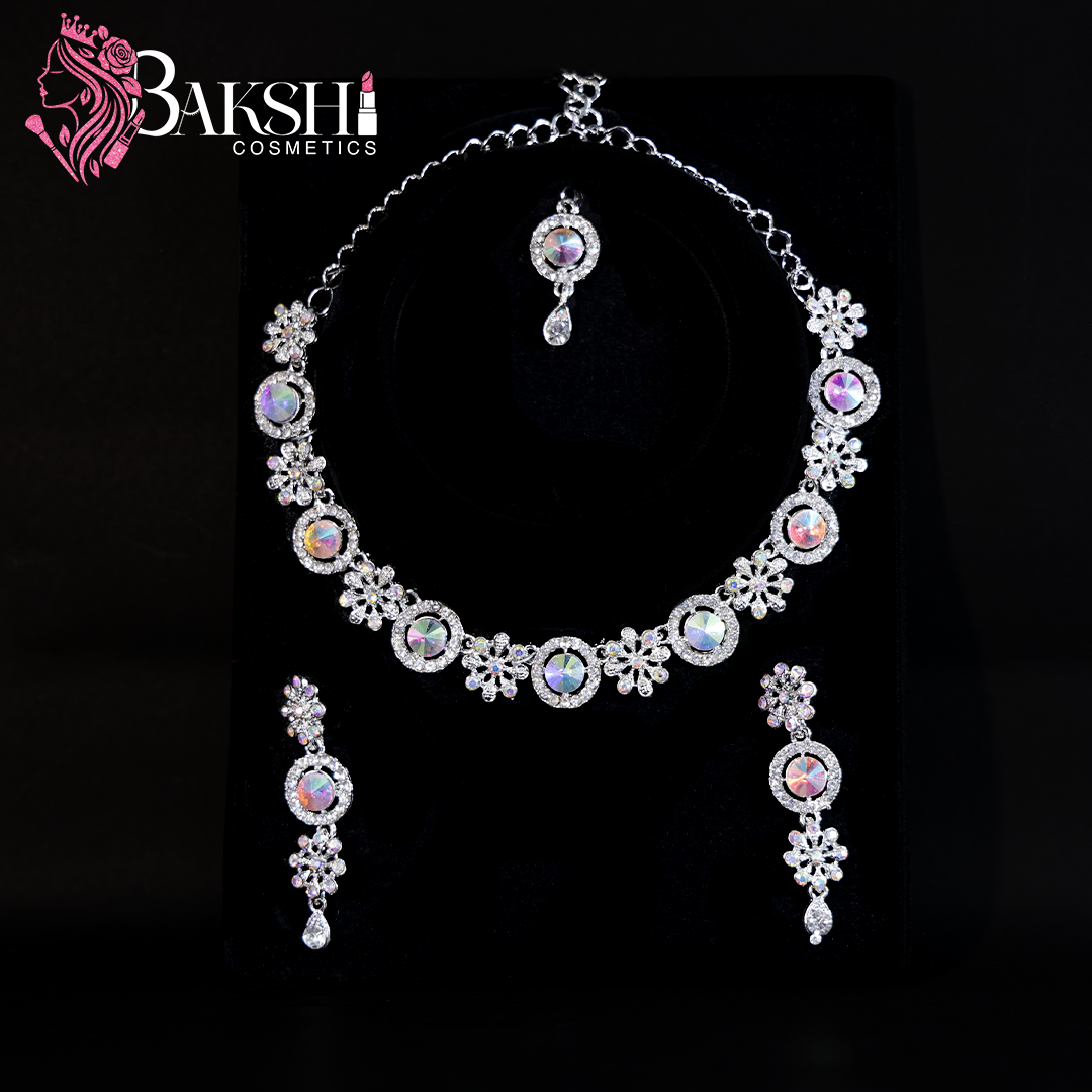 The matching earrings mirror the necklace’s floral pattern, making it perfect for parties, festive occasions, and special celebrations. The silver-tone finish with iridescent stones gives it a trendy yet elegant vibe that pairs well with both traditional and modern outfits.