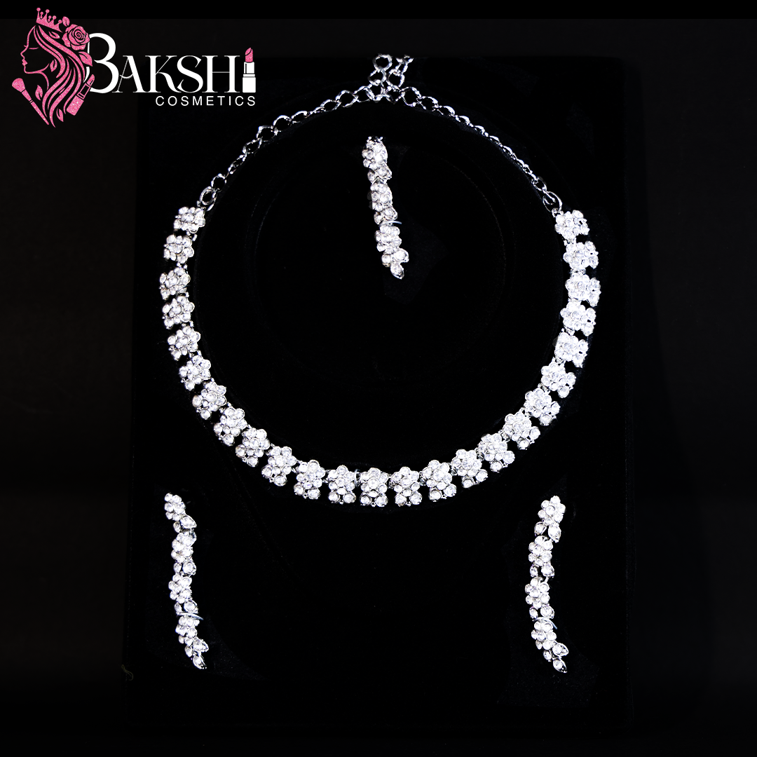 This Floral Shine American Diamond Necklace Set is a perfect blend of grace and sparkle. The necklace features a continuous row of delicate flower motifs, each studded with high-quality stones that catch the light beautifully.