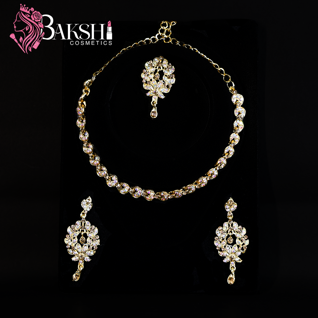 The warm gold-tone finish enhances its luxurious appeal, making it perfect for weddings, festive celebrations, and special occasions. The set includes a beautifully designed necklace, matching statement earrings, and a coordinated maang tikka to complete your ethnic look effortlessly. Lightweight and comfortable, it offers glamour without heaviness.